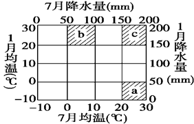 小题1:注意读图的正确性。一月和七月气温和降水都不在同一数轴上易出错。a地气候的特点是:一月气温0℃以下,降水在50 mm以下,7月气温在20℃--30℃之间,降水在150 mm---200 mm之间,符合温带季风气候特征。故选B项。