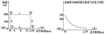 1、单选题 该图分别为“我国某地区的热力环流剖面图”(左图)和“该地区近地面与600米高空垂直气压差分布图”(右图),读图回答问题。