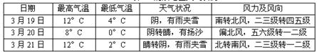 2、单选题 2010年3月20日北京出现浮尘、扬沙天气。依据表判断形成该现象的主要天气系统是