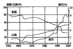 本题解析:1.本题图有一个特别之处,就是左侧纵坐标代表铁路、公路的客运比重,右侧纵坐标代表航空的客运比重,所以1991年即使三条曲线重合也不能代表铁路、公路、航空的旅客周转量大致相同。正确答案选B。