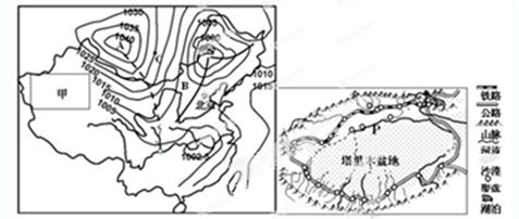 5、填空题 读“我国冬季某时的气压分布图和甲区域地理事物分布图,完成下列问题。(20分)