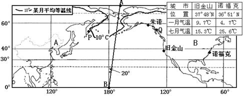 3、综合题  下图为北太平洋周边区域图,图中AB为晨昏线,读图回答下列问题。(15分)