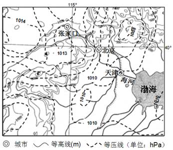 (2)图中北京的风向为        ,此时天津的天气特征       ,其成因是       。(4分)