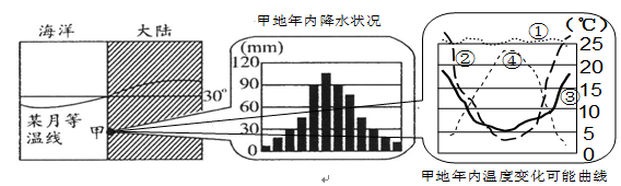 小题2:在“甲地年内温度变化可能曲线”图中,与甲地一年中平均气温变化曲线最吻合的是