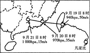 1、综合题 2010年第11号热带气旋“凡亚比”于9月15日20时生成,16日11时发展为强热带风暴,23时加强为台风,17日18时加强为强台风,18日16时加强为超强台风。19日9时前后在台湾花莲附近沿海登陆,20日7时在福建漳浦沿海再次登陆(如图)。据中新社漳州9月21日报道,受强台风“凡亚比”登陆的影响,福建漳州两天来持续暴雨、局部大暴雨,造成辖区内部分房屋倒塌、水产养殖设施被毁、农作物受淹、基础设施损毁,受灾人口52.3万人。据此完成下列问题。(20分)