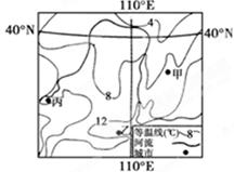 本题解析:本题考查我国的区域地理和等温线的综合判断。图示甲城市西侧的等温线向南突出反映“凸高为低”,结合当地的地理位置判断为太行山区;乙城市所在地区的等温线向西弯曲反映“凸低为高”,主要是由于位于渭河谷地。