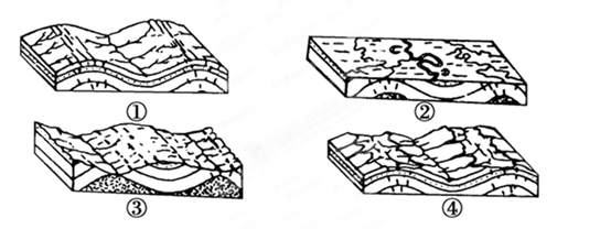 本题解析:本题考查地质构造和地形。。①表示岩层受力弯曲,背斜成山、向斜成谷;④表示在外力作用下背斜顶部受侵蚀;②表示该区域在外力的侵蚀下地表变得平坦;③表示在外力的不断侵蚀下,背斜部分成谷,向斜部分因槽部岩石受到挤压不易被侵蚀反而成为山地。故第(1)题选 B,第(2)题选 A。