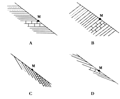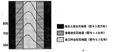 小题2:图示地区的岩层都含有古生物化石,应为沉积岩,有层理结构,不可能是质地坚硬而致密的岩浆岩和变质岩。C选项正确。