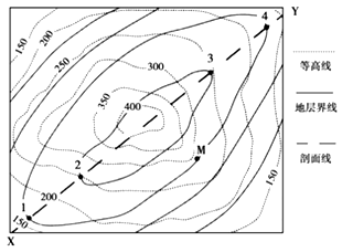 3、单选题 如图为某区域等高线(单位:米)及地层示意图。读图完成下题。