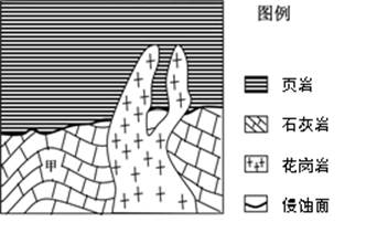 1.解题时注意根据题目要求判断图中甲地层褶皱后的地质过程。甲地层石灰岩上存在侵蚀面,说明甲褶皱形成后,因为地面上升,海拔较高,容易发生侵蚀作用,在侵蚀面上形成页岩说明后来地壳运动下沉,当地由于地壳运动下沉,海拔较低,又发生了沉积作用。花岗岩是侵入岩,地壳中存在花岗岩说明该地区还发生了岩浆的侵入作用。花岗岩和沉积岩的新老关系我们可以根据“覆盖者新,被覆盖者老;插足者新,被插足者老”的规律来判断。图中花岗岩插足到石灰岩、页岩中,说明花岗岩形成在石灰岩、页岩以后,故该处在沉积作用后发生了岩浆活动(岩浆的侵入作用)。