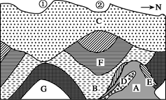 3、单选题 下图为“某地地质剖面图”,其中C为沉积物,B、F、G为沉积岩,A、D为不同时期的岩浆岩,E为变质岩。据此完成下列问题。