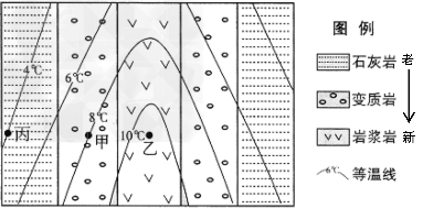 2.在甲、乙、丙三处中最有可能发现动植物化石的是处________,如果发现的是三叶虫化石,则可判定该处地层形成于_________代。甲处岩石最可能是变质岩中的__________岩,形成乙处岩石的物质直接来源于______________。