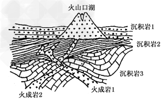 2、单选题 下图示意某地的沉积岩层与火成岩体的相互关系。回答1~2题。