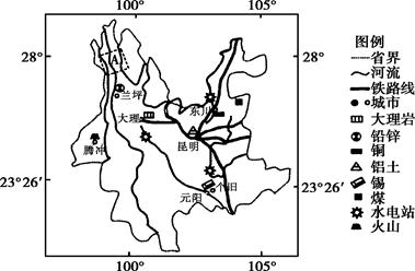 (3)读图,根据图例可以判断,东川铜矿等有色金属矿产资源丰富,发展有色金属工业的原料充足。附近有水电站和煤矿,发展有色金属冶炼的动力充足(或能源丰富)。靠近河流,水源丰富,工业用水方便。临近铁路,交通便利,便于产品的运输和对外的联系。
