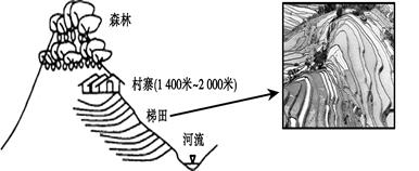(4)山上种树可以涵养水源,保持水土;山腰冬暖夏凉,水源洁净,适宜居住;山下海拔较低,热量充足,水、肥可顺地势自流至农田,利于水稻种植。(3分)