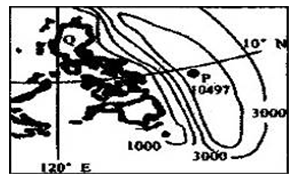 5、单选题 如下图所示,能正确表示7月份亚欧大陆与太平洋气压分布及P地风向的是