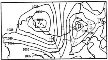 小题2:甲、乙、丙三条虚线处,能形成锋面的是?,图中①②③④⑤中较有可能降水的是?