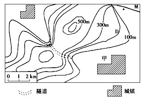 2、图中M处地形的海拔最高点相对于甲城镇的高度可能为