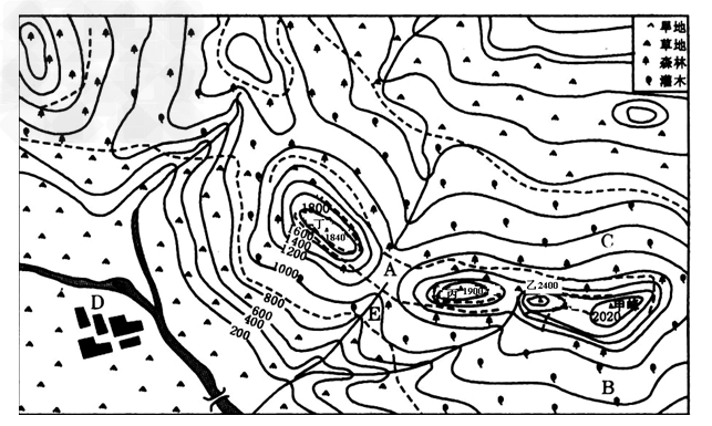(3 )甲峰B 坡900 米处的植被类型主要为 ______________?;实地考察发现C 坡植被生长好于B 坡,其原因可能是C 坡____________________________ 。