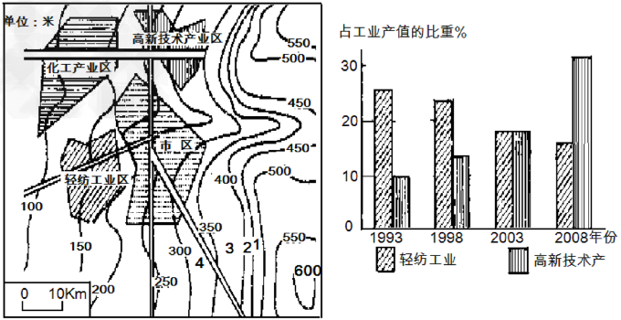 (3)伴随城市规模的扩大,M市建设了新的产业区。请在高新技术产业区和化工产业区中任选一个,依据图表信息对其区位进行客观评价。