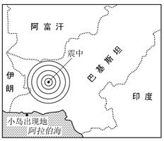 4、单选题 据中国地震台网测定,2013年9月24日19时29分在巴基斯坦发生7.8级地震,震源深度40千米,震中为北纬27.5°,东经65.6°。地震发生时,在震中西南约500千米的瓜达尔地区海岸外约600米的阿拉伯海中出现一个盾状小岛。据推测,这座小岛会在一个星期到两个月的时间内消失。读图回答下列