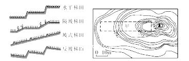 4、单选题 梯田是因地制宜发展农业生产的典范。下左图为四种不同类型梯田的剖面示意图,下右图所示某地面等高线地形图。读图回答下列问题。