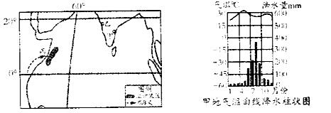 (1)说出此季节丙地相对于乙地的降水特点,并分析其主要原因。(3分)