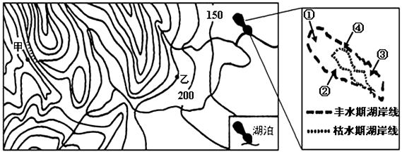 2、单选题 湖岸是指湖盆边缘与四周陆地相邻的地区,湖岸线是湖水面与湖岸的交线。读某地等高线(单位:m)图和湖岸线变化图,回答下列各题。