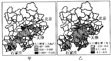 5、单选题 图甲、图乙分别示意京、津、冀都市圈2000年人口密度分布和人口增长率。据图回答1~2题。
