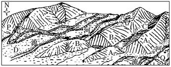 2、单选题 某中学的科考小组在某地进行地质考察,下图为某同学根据考察路线绘制的地貌素描图。据此回答下列各题。