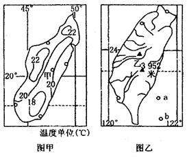 5、单选题 下图中图甲是甲岛等温线分布图,图乙是水系分布图,根据图中信息回答问题。