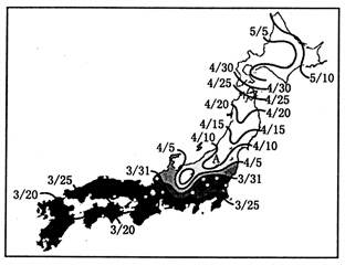 小题3:利用樱花开花期等值线,日本樱花最早是在国土的南部开放,时间大约是3月15-20日;最晚是在国土的北部,花开时间大约是5月10-15日,因花期6天,所以最晚欣赏樱花时间应为5月15-20日。由此推断全日本樱花开花时间范围共为57-67天。选项B正确。