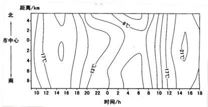 3、单选题 自某城市中心向南向北分别设若干站点,监测城市气温的时空分布。监测时间为8日(多云)9时到9日(晴)18时。监测结果如下图所示。据此完成1—3题。