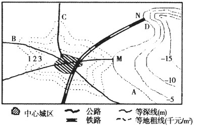 (1)说明图中"局部地区等地租线向外凸出"的含义及原因。