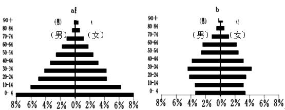 小题1:a图所示人口增长特点是高出生率、低死亡率、高自然增长率,是我国1953年的人口结构,老年人口比重较低;b图所示人口增长特点是高出生率、低死亡率、高自然增长率,是2010年的人口结构,0~14岁男女比例相当。