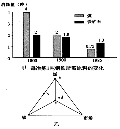 5、单选题 假定钢铁厂选址时只考虑运费,且运费仅与所运货物的重 量和运距成正比,图乙中c点与煤、铁产地和市场的距离相等。 据此完成1~2题。
