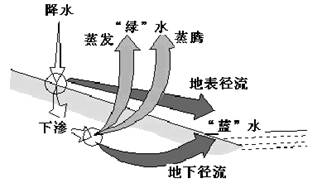 2、单选题 下图表示绿水资源与蓝水资源的划分,蓝水是降水中形成地表水和地下水的部分,绿水是降水下渗到土壤中的水,最终会进入大气。据此完成下列各题。