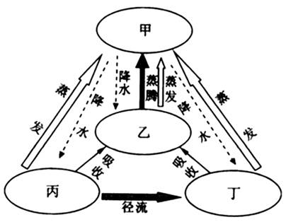 【小题1】丙、丁蒸发产生的水汽输送给甲,甲是大气圈;丙产生径流输送给丁,丙是岩石圈,丁是水圈;乙从岩石圈和水圈中吸收水份,通过蒸腾作用输送到大气圈,乙是生物圈。选A正确。