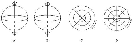 本题解析:地球绕着地轴不停的旋转,叫地球的自转。地球自转的方向是自西向东,在北极上空看,地球自转的方向为逆时针;在南极上空看,地球自转的方向为顺时针。读图可知,B符合题意。