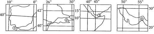 【小题1】读图,根据形状及经纬度判断,①是直布罗陀海峡,是欧洲、非洲分界,A错。②是土耳其海峡,是亚欧两洲分界,B错。③是曼德海峡,是亚洲、非洲分界,C错。④是霍尔木兹海峡,位于亚洲境内,不是洲界,D错。