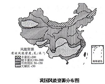 (2)西部地区常年盛行偏西风,接近势力强劲的冬季风源地;北面上风处又是平坦广阔的戈壁滩,摩擦力小,使得该地风速强大。东南沿海:距我国夏季风源地较近,加之海洋上台风作用和海陆风影响,故风能资源丰富。(8分)
