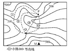 4、单选题 下图为某地地形略图,M点位于36.5N,两中学生分别到达P、M点,测量并计算出两点的相对高度是288米。回答下题