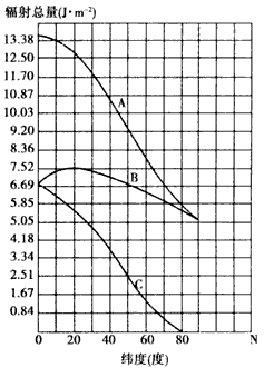 2、单选题 下图为太阳辐射随纬度变化坐标图,关于图中A、B、C所表示地理含义的描述正确的一组是: ( )