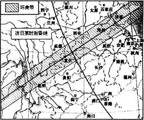 1、单选题 2010年某日出现本世纪时间最长的日环食,我国观测条件非常有利,除了环食带内可以观测到日环食以外,全国太部分地方都可观测到日偏食。读图回答各题。