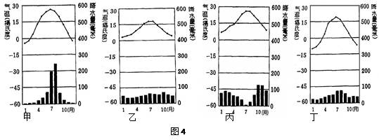 【小题4】根据图示:①地降水季节变化较大;④地年降水量最多,气温的年较差最小;②地年降水量最少,气温的年较差最大。所以本题选择C选项。