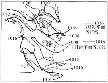 【小题1】读图,a月陆地气压高于同纬度的海洋,说明是冬季,1月份。b月陆地气压低于同纬度的海洋,说明是夏季,7月份。所以气压不同主要原因是海陆热力性质差异,①对。洋流分布 ,只影响沿岸地区,不影响大陆内部,②错。地形起伏只影响局部地区,不影响整个大陆,③错。 太阳直射点的回归运动,导致地球上的季节变化,④对。C对。