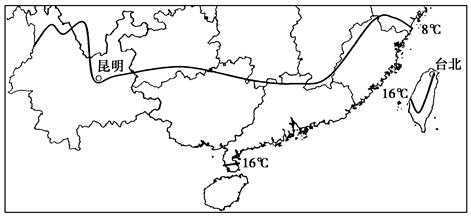 【小题2】图示昆明的温度低于台北,是因昆明地势高,气温低;昆明距海远,一月受海洋影响小,气温低;台北沿岸有暖流经过,所以温度高;而寒潮对两地的影响较小。故选C。
