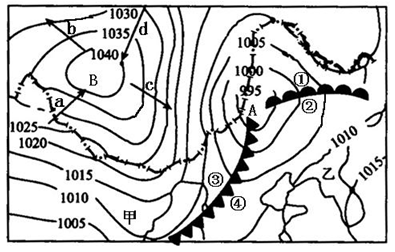 ⑵图中a、b、c、d四处风向正确的是?地;甲地比乙地?(选择填空)