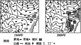 (3)分析图示地区2009年与1949年农业用地的明显变化及对地貌带来的影响。(4分)