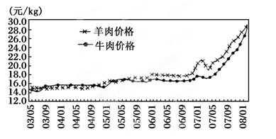 材料一 该图为2003年5月至2008年2月期间我国牛羊肉批发价格变化曲线图。